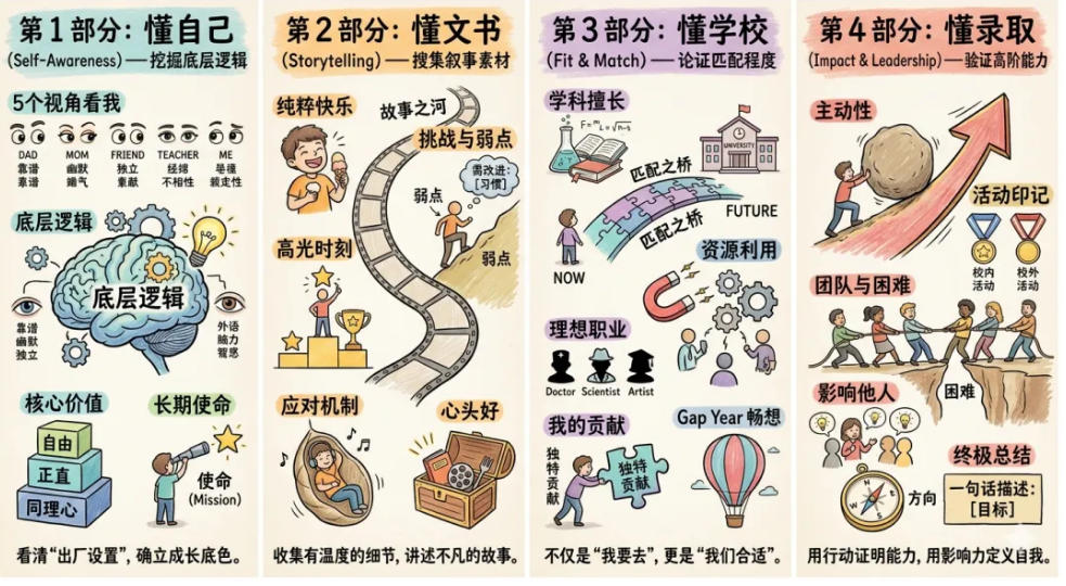 顶级的文书布局,绝不是碎片化地回答问题,而是通过这 49 个深度提问,完成对以下四个维度的严密闭环。只有当这四个维度相互咬合,你的申请形象才会从“纸片人”变成“立体的人”。