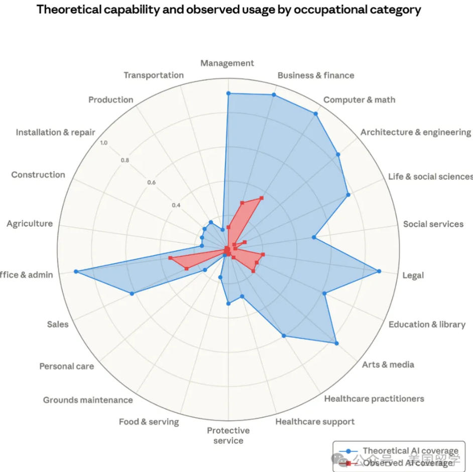 这份报告之所以能火出圈,是它因为不再只是“纸上谈兵”预测,不仅分析了 AI “理论上”能做什么,还首次调取了 Claude 真实的后台脱敏数据。