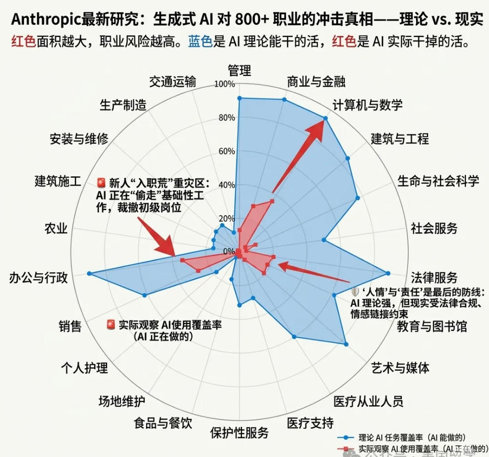 蓝色区:代表 AI 的“理论上限”,而中间那一点点可怜的红色,才是目前 AI 真正落地的程度。