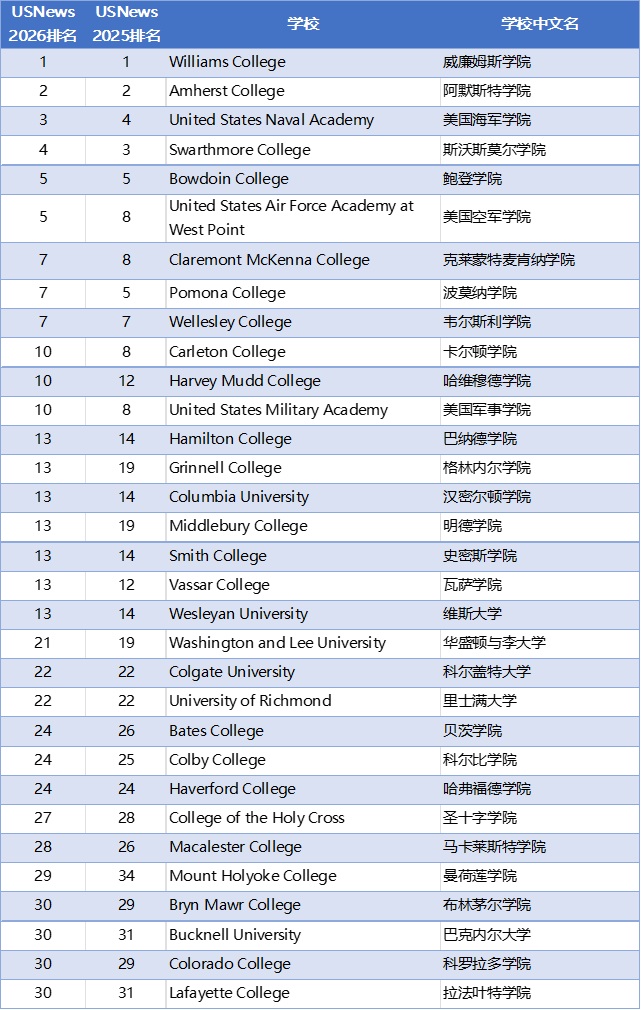 2026 USNews美国文理学院排名